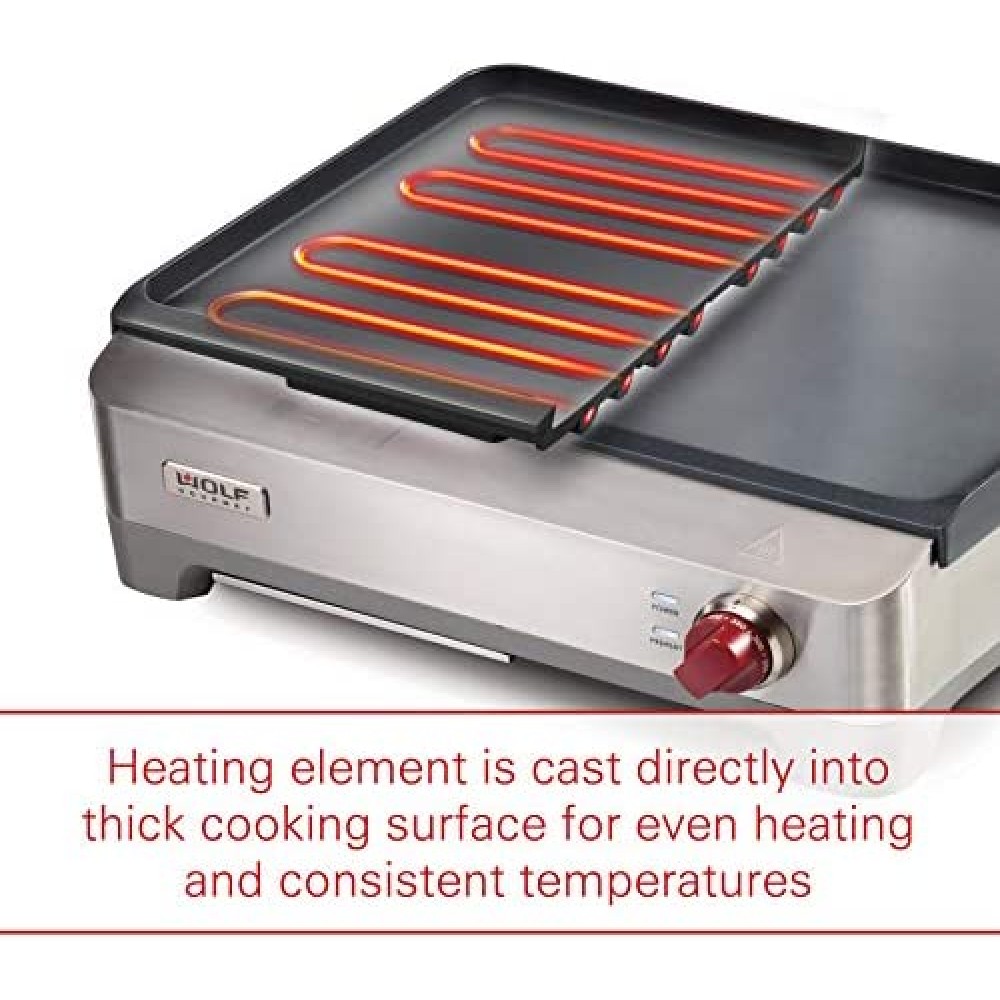 CALENTAMIENTO EXCEPCIONALMENTE UNIFORME: Los elementos calefactores de precisión están integrados en la gruesa superficie de cocción de aluminio fundido para lograr temperaturas constantes y una retención uniforme del calor.