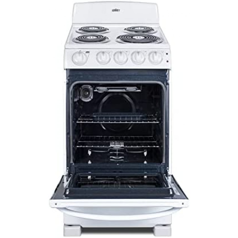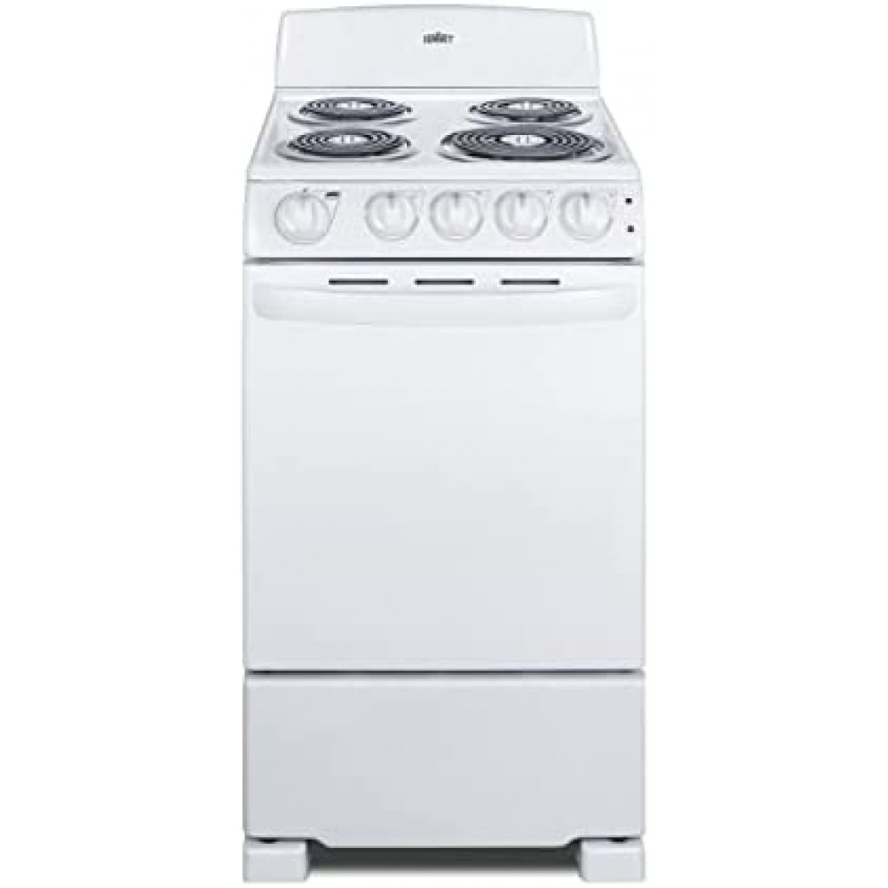 Electrodomésticos Summit RE203W 20? Estufa eléctrica con 4 elementos de bobina, color blanco, capacidad de horno de 2.3 pies cúbicos, luces indicadoras de ENCENDIDO para horno y elementos que cumplen con ADA