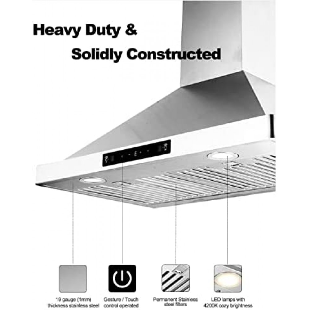 Calidad superior y diseño moderno: la campana extractora de montaje en pared Everkitch está hecha de acero inoxidable 430 de calibre 19 (1 mm) de espesor, que tiene una apariencia elegante y una construcción sólida. El diseño de carcasa resistente permite que la campana de ventilación funcione sin vibraciones, incluso a la velocidad más alta.