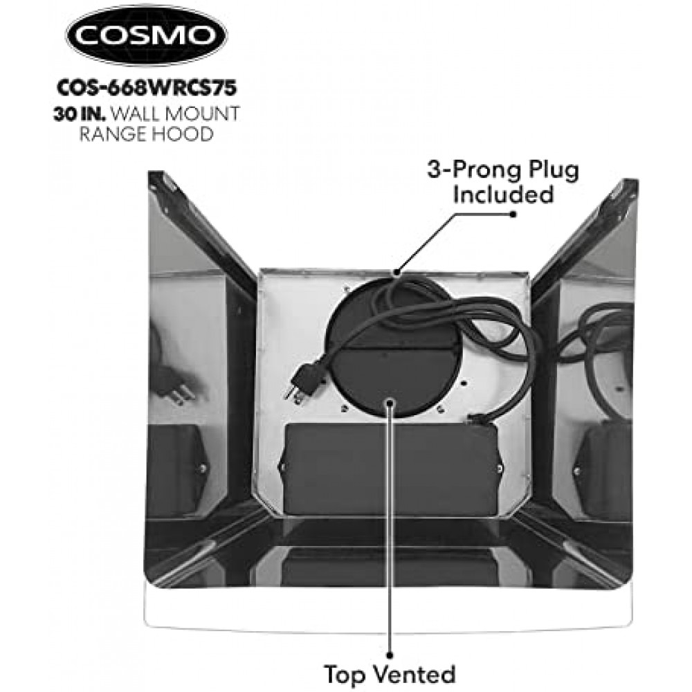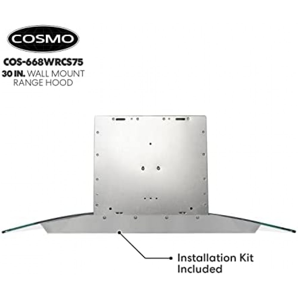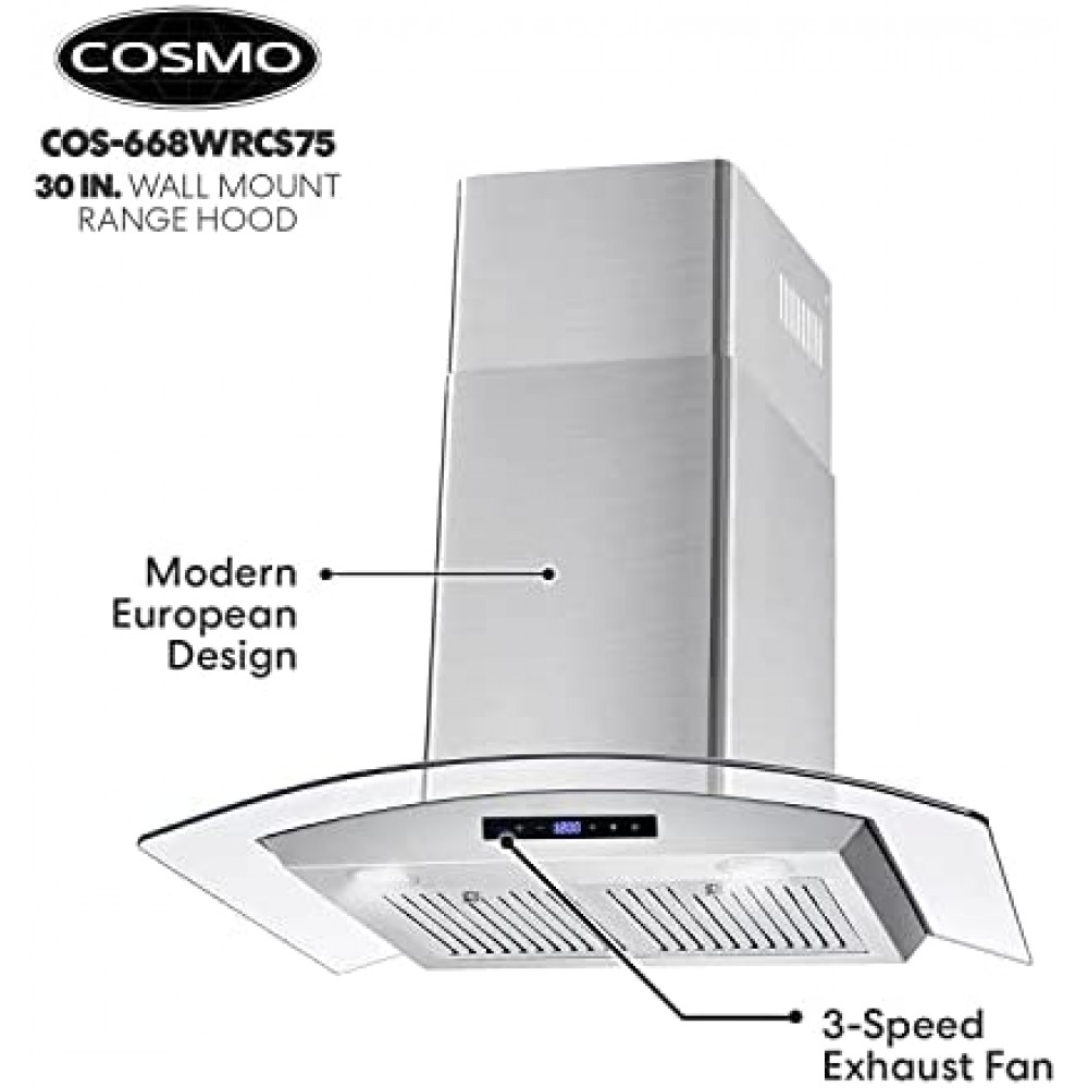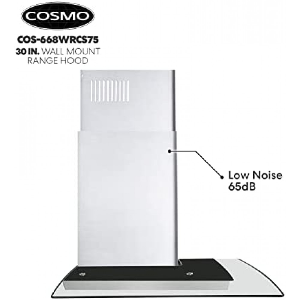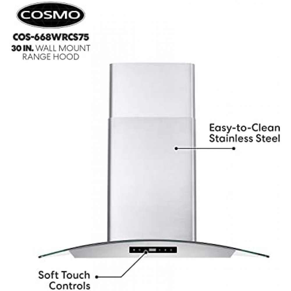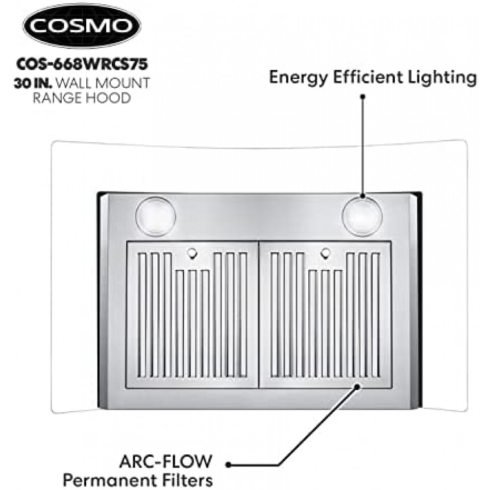 Cosmo?s COS-668WRCS75 combina vidrio curvo y acero inoxidable, la pieza central perfecta para cualquier cocina moderna. Los diseños fluidos de nuestros 30? La campana extractora de montaje en pared viene con un eficiente motor centrífugo de 380 CFM que atrapa el humo y los vapores para que no permanezcan en su hogar. Las campanas extractoras Cosmo incluyen filtros permanentes ARC-FLOW que brindan un mayor flujo de aire y son aptas para lavavajillas para una fácil limpieza. Panel de control táctil LCD de alta tecnología para administrar múltiples funciones, incluidas 3 velocidades de ventilador e iluminación LED para mayor visibilidad.